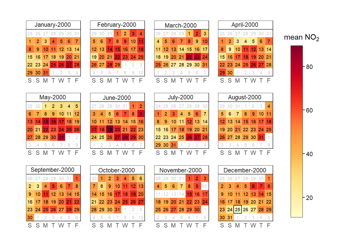 multipanel <- calendarPlot(mydata, "no2", year = 2000, plot = F)$plot