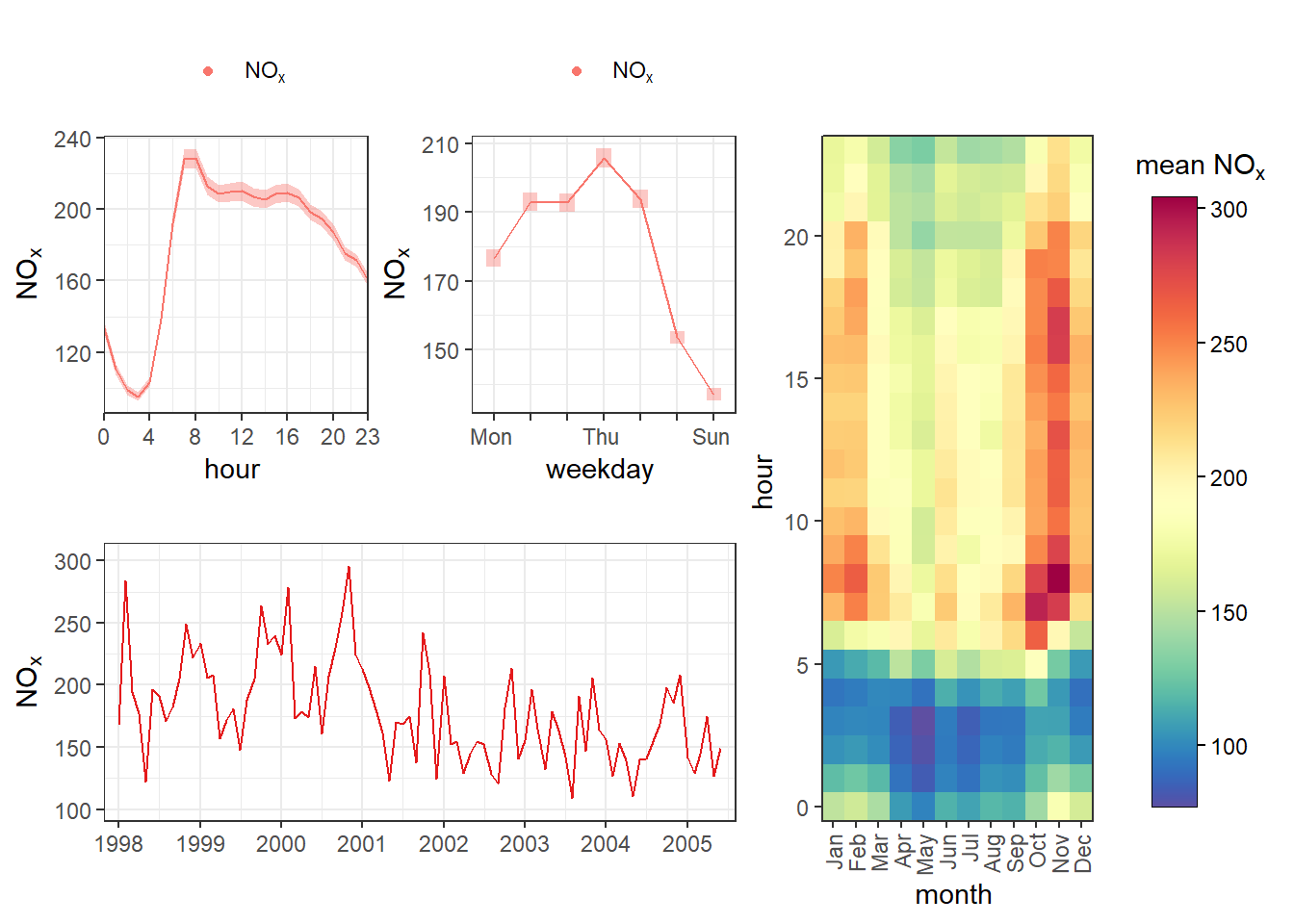 A few openair plots are actually multiple plots in one. You can typically tell this because the different “panels” are arranged on an irregular grid (e.g., timeVariation()) or are comprised of very different plot types (e.g., conditionalEval()). These plots are powered by the patchwork package, which makes it simple to extract and modify sub-panels. For timeVariation(), the “top” panel can be accessed with [[1]] and the “bottom” three with [[2]][[1]], [[2]][[2]], and [[2]][[3]].1