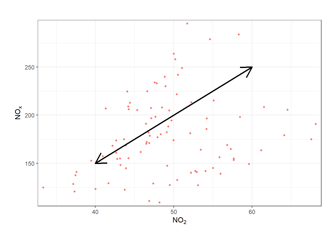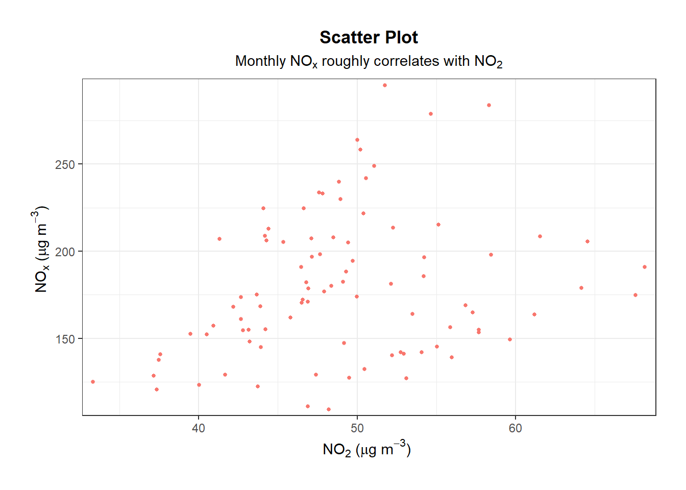 In this case, we set x = I(0.01). The I() function tells ggplot2 to ignore the data scale (e.g., 30 to 70 units of NO2) and instead use a relative scale (0 at the far left, 1 at the far right). This is really helpful - for example, you may create a lot of different timePlot() plots with different x-axis scales - x = I(0.01) will always mean “nudged a little bit from the far left of the plot”.