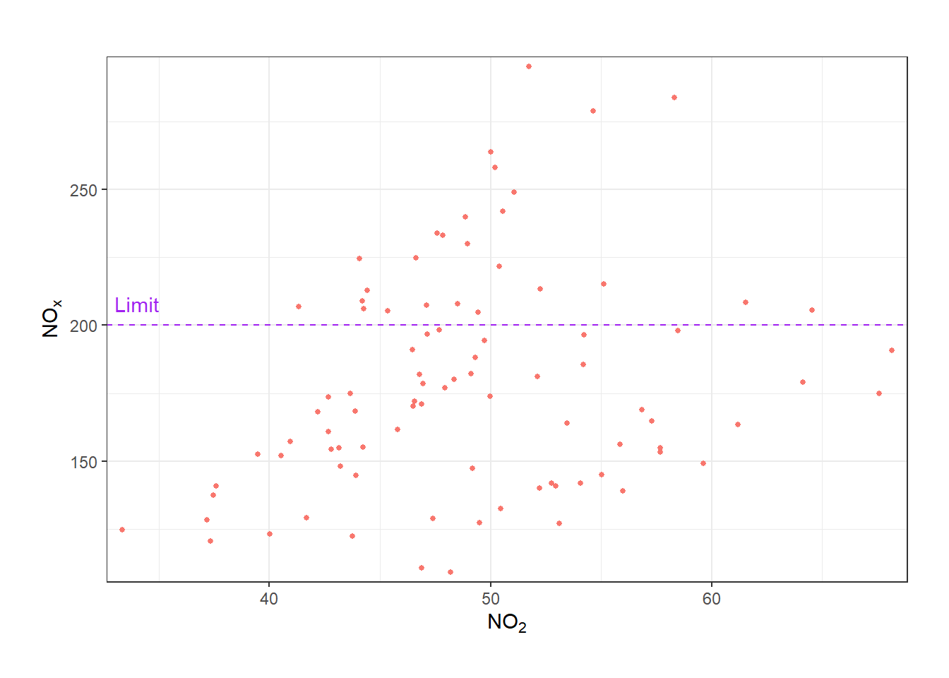 To add a reference line, you use ggplot2::geom_hline() or ggplot2::geom_vline(). In this example, a horizontal dashed purple line is added at y = 200, along with an annotation to label it as “Limit”. The lty parameter controls the line type (e.g., dashed, dotted), and color specifies the color of the line.