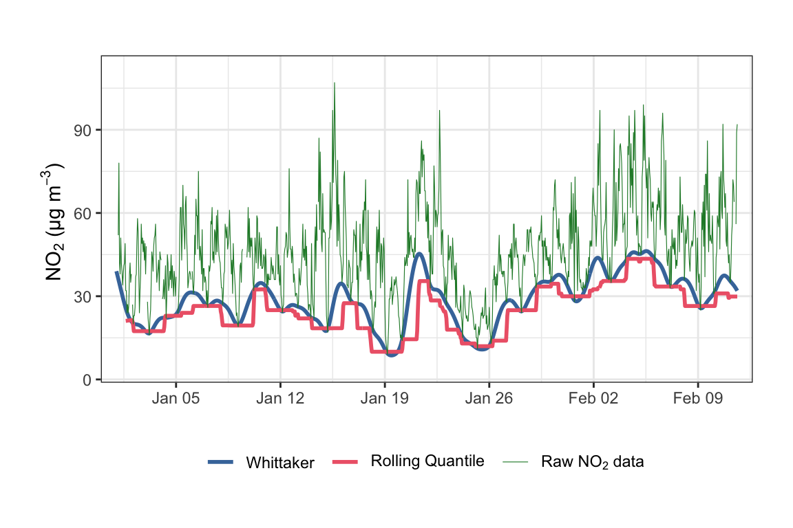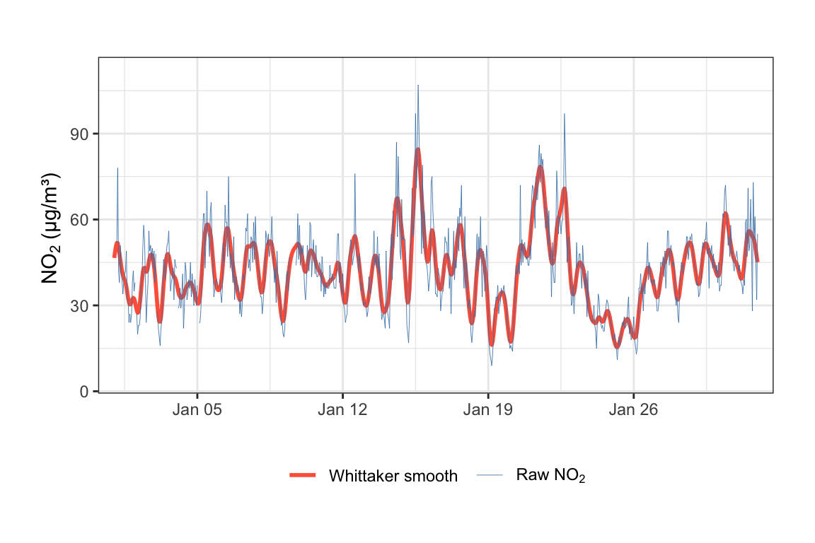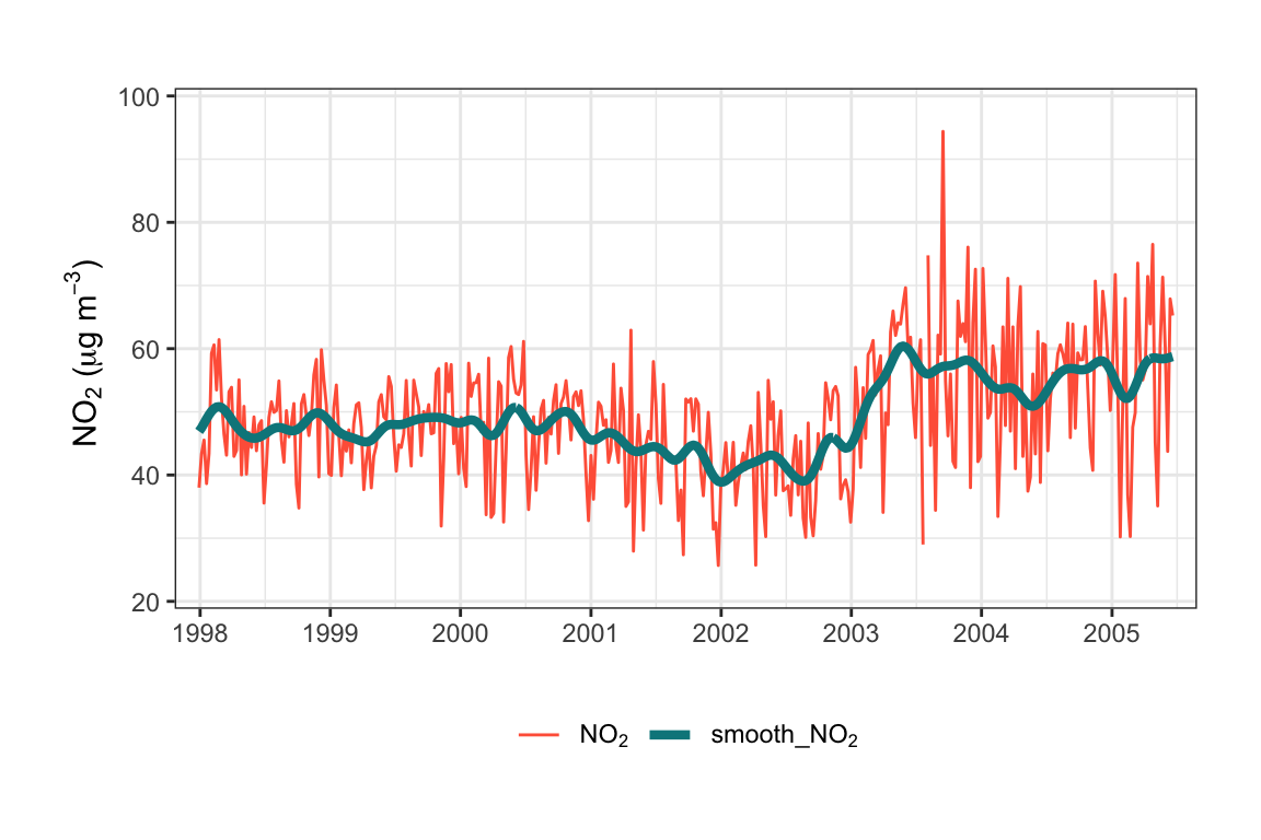 Note that timeAverage() has a type option to allow for the splitting of variables by a grouping variable. The most common use for type is when data are available for different sites and the averaging needs to be done on a per site basis. That being said, unlike other data utility functions, timeAverage() will warn if there are duplicate dates in the input data frame but still allow the calculation to continue; occasionally averaging across multiple sites may be a legitimate thing to do (e.g., averaging across many low-cost air quality sensors to calculate a more accurate ‘consensus’ time series).