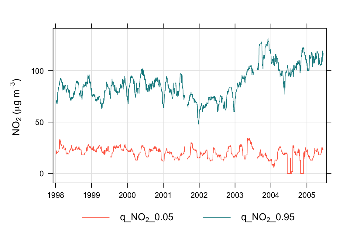 calcPercentile() shares many of its arguments with timeAverage(), such as type, data.thresh, start.date, and end.date. It also has the argument prefix to define how the columns it creates are labelled.