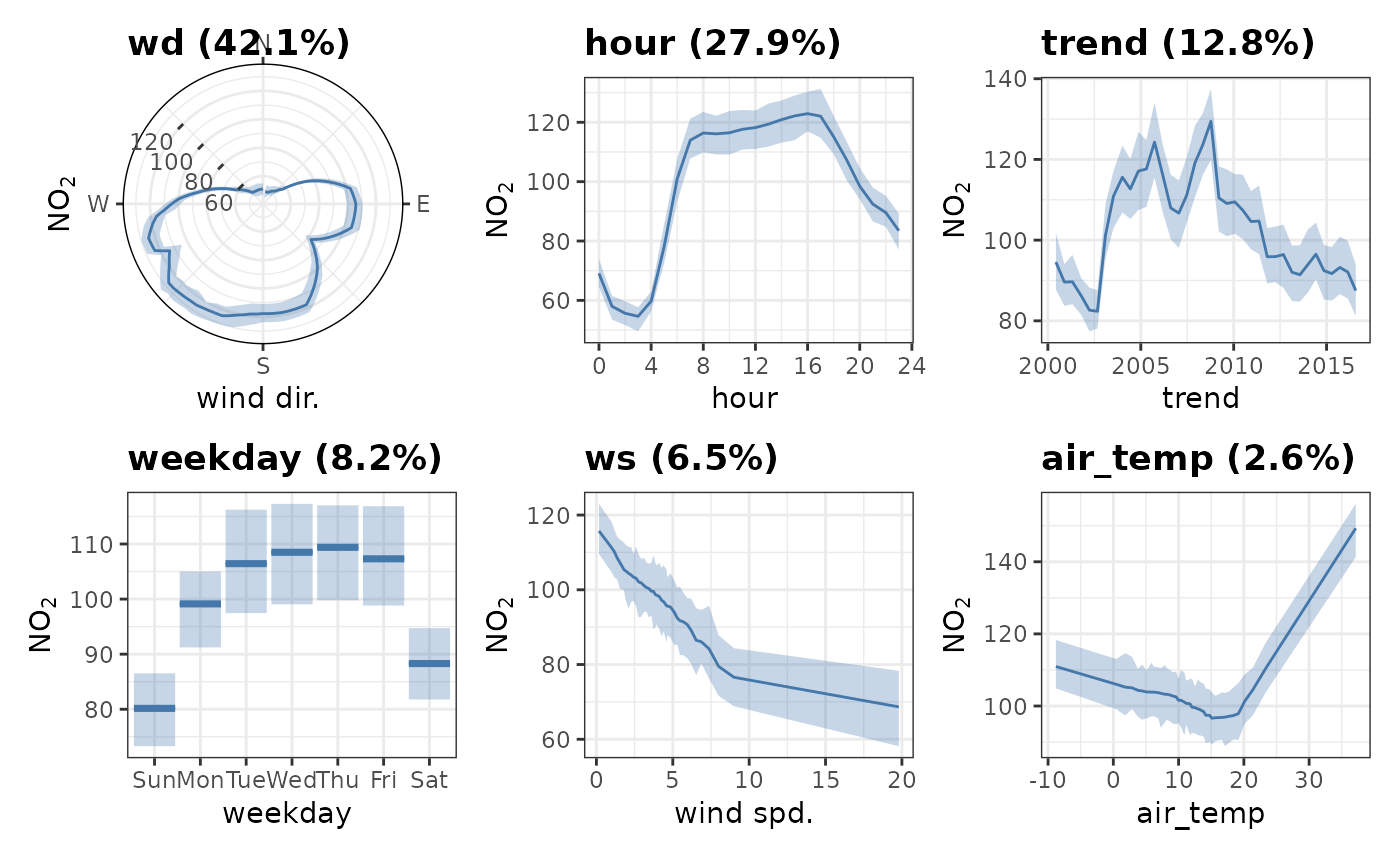 The deweather package uses a powerful statistical technique based on boosted regression trees using a variety of packages using the tidymodels framework. This allows for a variety of engines to be employed, with the default being xgboost. Statistical models are developed to explain concentrations using meteorological and other variables. These models can be tested on randomly withheld data with the aim of developing the most appropriate model.