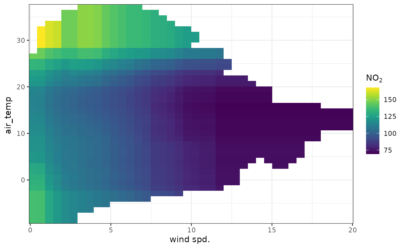 The plot shows the trend in NO2 controlling for the main weather variables. The plot now reveals the strong diurnal and weekly cycle in NO2 that is driven by variations in the sources of NO2 (NOx) rather than meteorology, i.e., road traffic which has strong hourly and daily variations throughout the year. It can be useful to simply average the results to provide a better indication of the overall trend. For example: