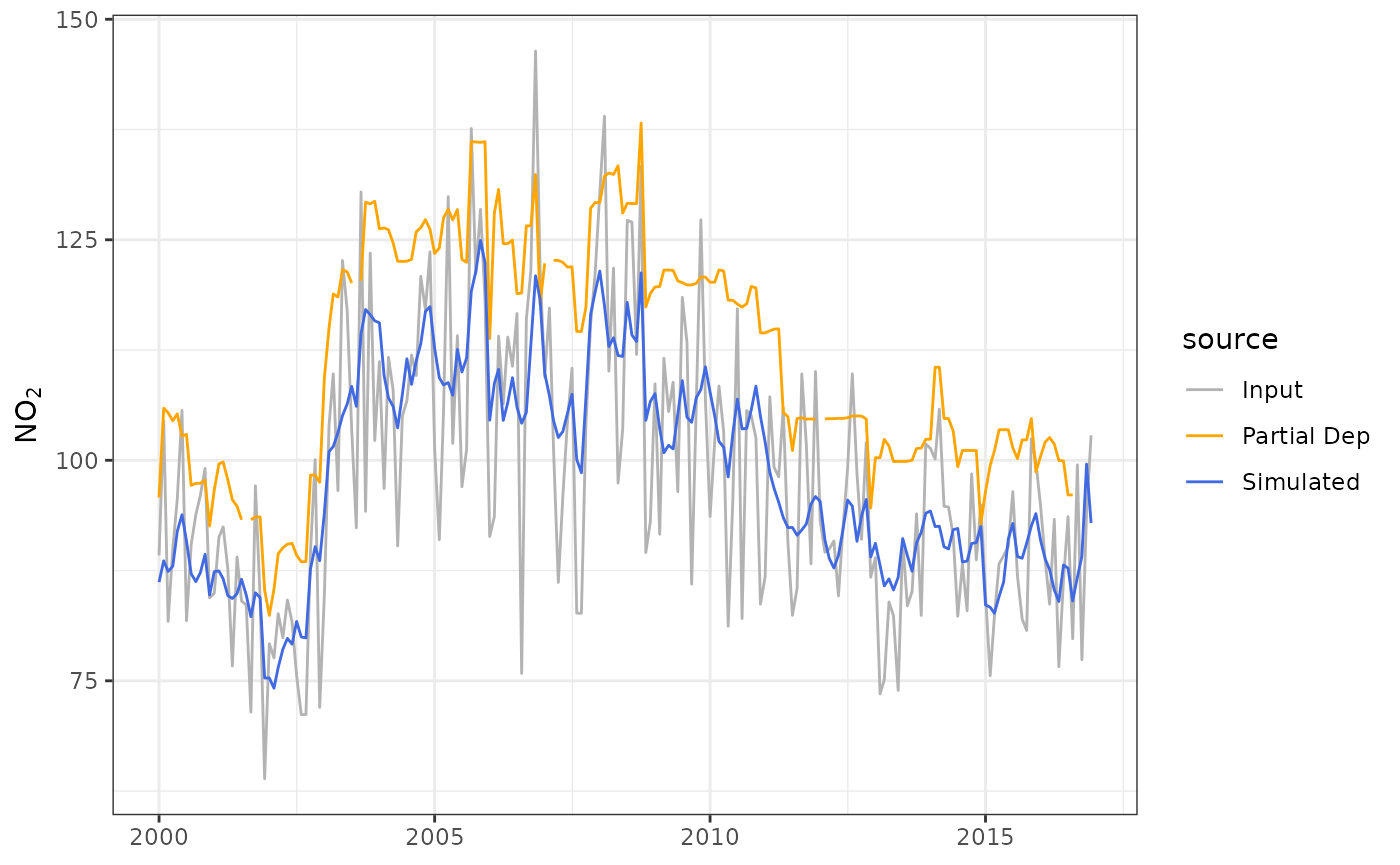 With some simple data manipulation, we can compare the meteorological simulation, the partial dependence profile, and the input data. It is clear that the input data has much more noise. The PD profile are simulated data are similar, but the simulated data are higher overall. This highlights that purely relying on the PD profiles (which isolates the trend from even temporal variables like day of the week) may underestimate pollutant concentrations.