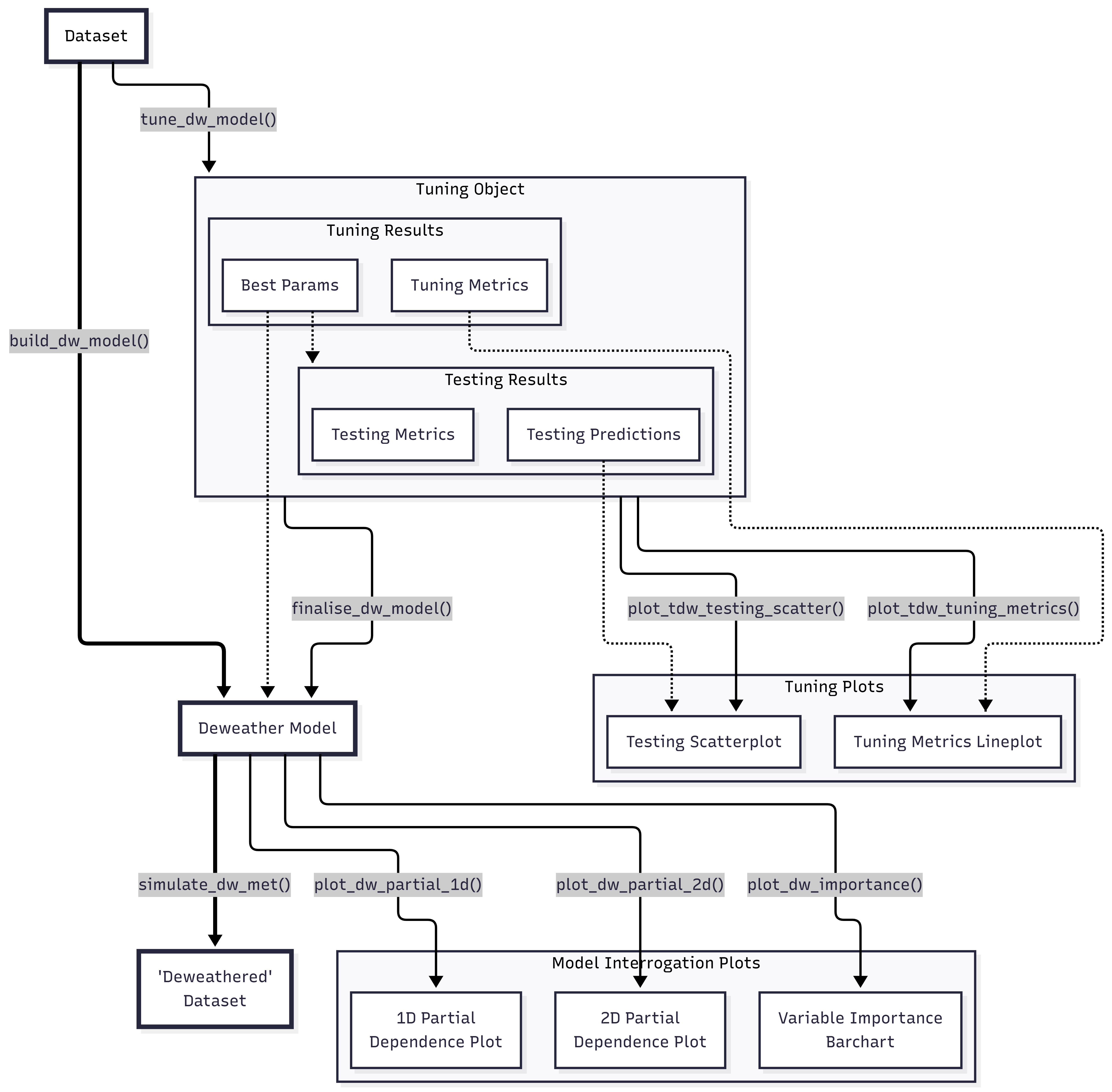 By default, the deweather package uses a powerful statistical technique based on boosted regression trees using a variety of packages using the tidymodels framework. This allows for a variety of engines to be employed, with the default being xgboost. Statistical models are developed to explain concentrations using meteorological and other variables. These models can be tested on randomly withheld data with the aim of developing the most appropriate model.